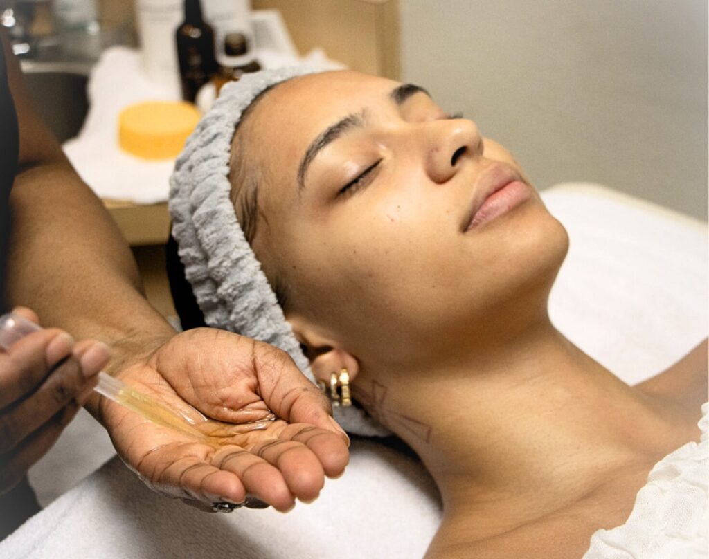 The Ultimate Glow Up. This facial begins with a light AHA peel to combat dullness and reveal a fresh new layer, ready to be deeply infused with hyaluronic acid, botanical peptides, & essential oils. A customized mask seals in the moisture, leaving your skin smooth and luminous.